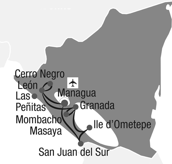 Nicaragua grandeur nature Managua - Leon - Granada - Ometepe - San Juan del SurCircuit individuel. Partez à la découverte du Nicaragua, terre de contrastes où volcans actifs, villes coloniales et plages sauvages se mêlent à des paysages spectaculaires. Des îles volcaniques surgissant du lac Nicaragua aux marchés colorés et traditions locales, ce voyage promet une immersion authentique au cœur d’une nature préservée et d’une culture chaleureuse.___________________Jour 1 ManaguaArrivée à l’aéroport de Managua, accueil et transfert à l’hôtel. Reste de la journée libre. Nuit à Managua.Jour 2 Managua / LeónVisite guidée de Managua, capitale du Nicaragua, avec ses principaux sites emblématiques : le quartier historique, la Place de la Révolution et le Malecón en bord de lac. Prise en charge de votre véhicule de location puis départ en direction de León, ancienne capitale du pays et cité coloniale au riche patrimoine. Nuit à León.Jour 3 Volcan Cerro Negro / LeónAccompagné de votre guide, départ vers le volcan Cerro Negro, l’un des plus jeunes d’Amérique centrale. Une randonnée d’environ 1h30 vous mène jusqu’à son sommet, offrant de superbes panoramas sur la cordillère volcanique. La descente sur ses pentes de cendre noire promet une expérience unique et riche en sensations. En début d’après-midi, visite guidée de León pour découvrir son centre historique, sa cathédrale classée à l’UNESCO et ses fresques murales. Nuit à León.Jour 4 Las PeñitasDépart vers le petit village de pêcheurs de Las Peñitas. Accompagnés d’un guide local, embarquement en panga, barque traditionnelle à moteur, pour explorer la réserve naturelle de l’île Juan Venado. Ce sanctuaire protégé abrite une riche biodiversité: mangroves, oiseaux marins et, selon la saison, tortues marines. Retour à Las Peñitas et après-midi libre pour profiter de sa plage bordée de palmiers et de l’océan Pacifique. Nuit à León.Jour 5 León / GranadaMatinée libre pour flâner à León. Dans l’après-midi, route en direction de Granada, l’une des plus anciennes cités d’Amérique latine, fondée en 1524 au bord du lac Nicaragua. À l’arrivée, visite guidée de cette ville colorée, véritable bijou colonial aux ruelles pavées, aux églises baroques et aux demeures patriciennes. Nuit à Granada.Jour 6 Volcan MombachoRendez-vous à l’entrée du volcan Mombacho et montée en camion 4x4 jusqu’aux sentiers qui traversent la forêt tropicale humide. Randonnée balisée auto-guidée sur le sentier El Cráter, au cœur d’une végétation luxuriante et de panoramas sur la région. Puis rencontre avec une communauté installée sur les flancs du volcan, pour découvrir les étapes de fabrication artisanale du chocolat. Nuit à Granada.Jour 7 Parc National du volcan Masaya / Laguna de ApoyoVisite libre du parc national du volcan Masaya, l’un des plus impressionnants du pays. Ses sentiers balisés permettent d’observer les paysages volcaniques et, selon l’activité, les fumerolles s’échappant du cratère Santiago. L’après-midi, temps libre à la laguna de Apoyo, vaste cratère volcanique aujourd’hui rempli d’eau douce, idéal pour la baignade. Nuit dans la région. Jour 8 Ile d’OmetepeRoute jusqu’au port de San Jorge puis traversée en ferry vers l’île d’Ometepe. Installation au parc Charco Verde, au pied du volcan Concepción. Après-midi libre pour détente ou découverte des environs. Nuit sur l’île d’Ometepe. Jour 9 Île d’OmetepeAccompagné d’un guide local, départ pour la randonnée menant au mirador du volcan Maderas. Le sentier traverse différents écosystèmes avant d’atteindre le belvédère offrant une vue spectaculaire sur la silhouette en «8» de l’île d’Ometepe et sur le cône du volcan Concepción. Dans l’après-midi, excursion en kayak sur le río Istian, au cœur d’une nature préservée riche en oiseaux et en végétation aquatique. Nuit sur l’île d’Ometepe. Jour 10 San Juan del SurRoute vers le port de Moyogalpa et traversée en ferry jusqu’à San Jorge. Continuation jusqu’à San Juan del Sur, petite ville de pêcheurs installée en bord d’océan Pacifique. Après-midi libre pour vous détendre ou profiter de l’ambiance décontractée, entre plage et village animé. Nuit à San Juan del Sur.Jour 11 Playa HermosaJournée de détente au bord de l’océan Pacifique. Profitez du cadre naturel préservé de Playa Hermosa, longue plage de sable blanc bordée par la végétation, idéale pour la baignade ou une promenade au grand air. Nuit à San Juan del Sur.Jour 12 ManaguaRoute vers Managua pour rejoindre l’aéroport. Restitution de votre véhicule. Assistance aux formalités d’enregistrement puis vol retour.___________________ Highlights• Managua, la capitale • Léon, ville de poètes • Granada, magnifique ville coloniale• Ometepe, l’île au 2 volcans • San Juan del Sur et ses plages du Pacifique• Nicaragua, terre de volcans actifseInclus• 11 nuits en hôtels 3* avec petit déjeuner• Voiture de location des jours 2 à 12• Transferts privés selon programme• Visites et excursions avec guide francophone selon programme• Déjeuner le jour 6• Documentation de voyage